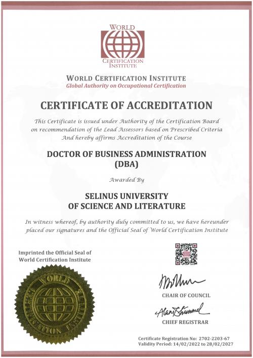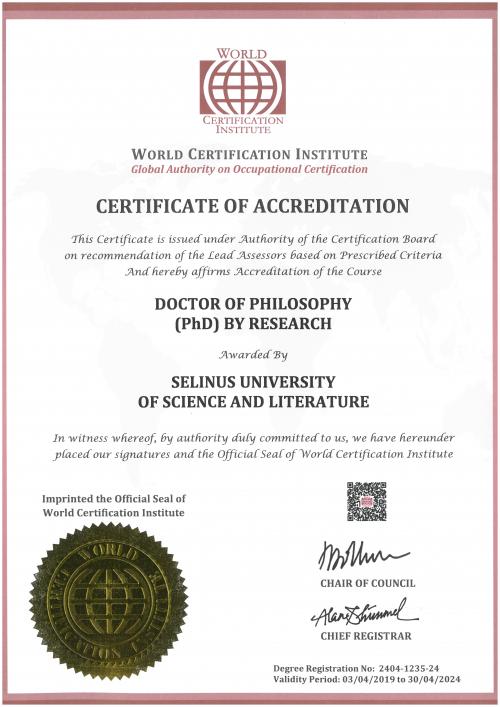 WCI has accredited Selinus University of Science and Literature after carefully reviewing, validating and authenticating its study programs. The World Certification Institute examined the following parameters: course content and duration, teacher qualifications and expertise, financial strength and integrity of course providers, available facilities and resources, delivery and assessment method and most importantly the titles relevance to professional and career development, in line with Selinus University's mission. The WCI Board has recognized that Selinus University's programs of study are up to global educational standards and conferred accreditation. University is not accredited by an accrediting agency recognized by the United States Secretary of Education.