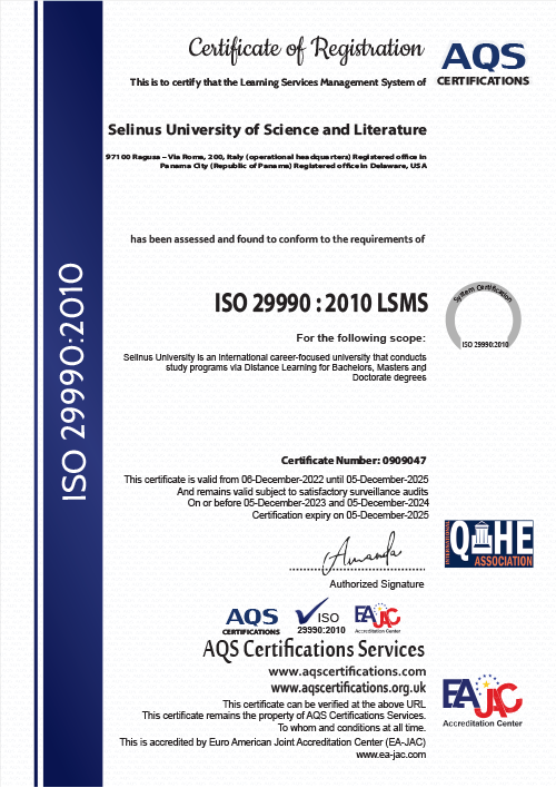 In February 2022, the Selinus University of Science and Literature was awarded the ISO 9001 quality management certification. A certification for which organisations must undergo thorough conformity checks by an accredited certification body and which attests to the quality with which Selinus University implements systems and solutions for its students. Since December 2022, it is also certified ISO 29990:2010 as an international university for the conduct of career-focused study programmes via Distance Learning for Bachelors, Masters and Doctorate degrees. Selinus University Business Scholl is also certified ISO 21001:2018 EOMS as an International business school for Professionals, Managers and Entrepreneurs for conducting study programmes aimed at awarding Bachelors of Business Administration (BBA) Masters of Business Administration (MBA) Doctor of Business Administration (DBA).