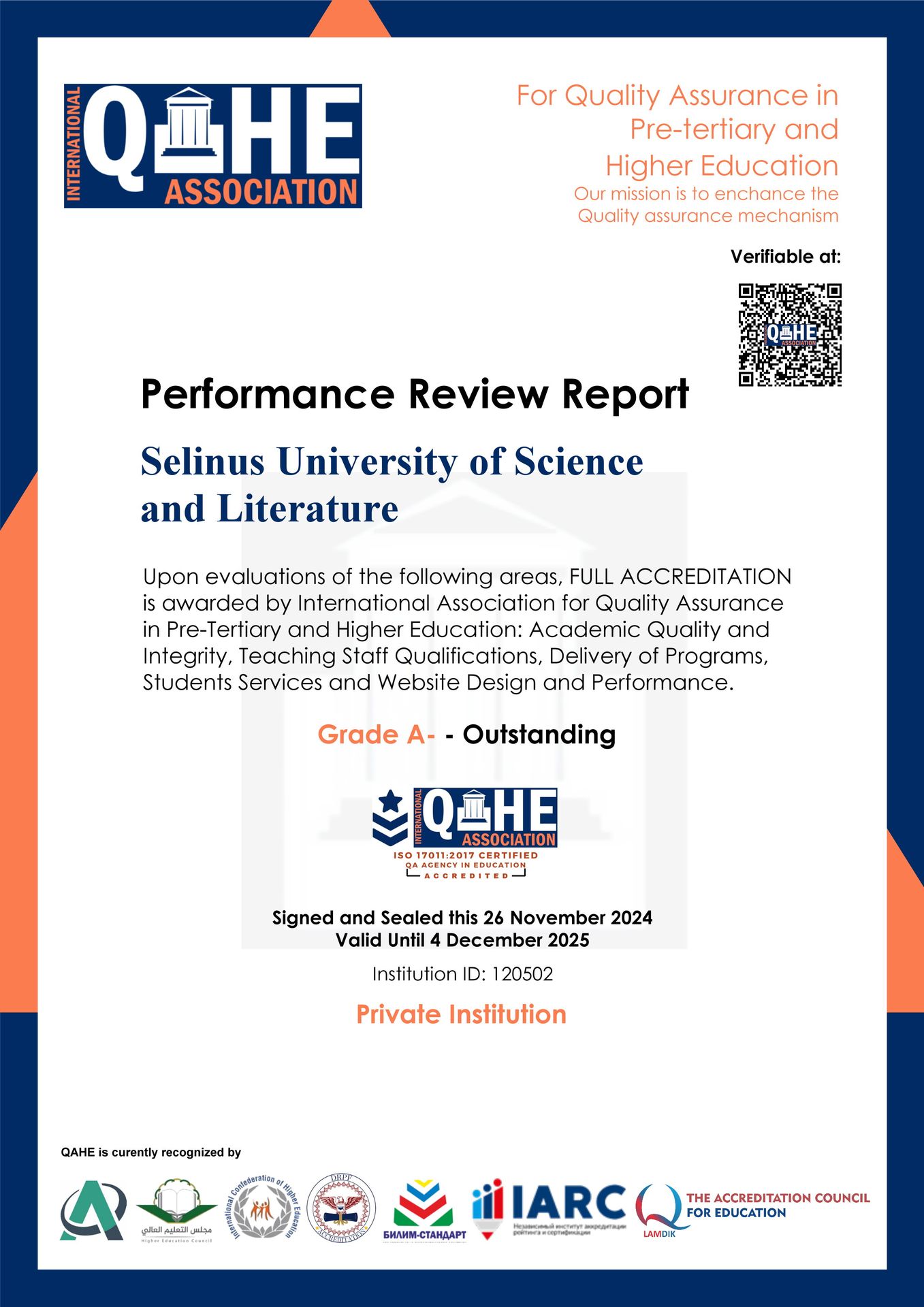 QAHE is an expert in recognizing higher education institutions for research performances, student services and quality of teaching to value the confidence of the public along with supporting the development of quality assurance systems worldwide. Furthermore, QAHE has been assessed and found to conform to the requirements of ISO 9001: 2015(Quality Management System), ISO 29990 (Non-formal Education and Training Services Management System), ISO/IEC 17011:2017 (requirements for the competence, consistent operation and impartiality of accreditation bodies assessing and accrediting conformity assessment bodies), ISO/IEC 17040:2005 (the general requirements for the peer assessment process to be carried out by agreement groups of accreditation bodies or conformity assessment bodies), ISO 20000:2018 (Service Management System) and ISO 27001:2013 (Information Security Management System). With its huge network and recognition from worldwide organizations, QAHE accreditation status signifies your institution’s commitment to quality education which is in compliance of international standards.