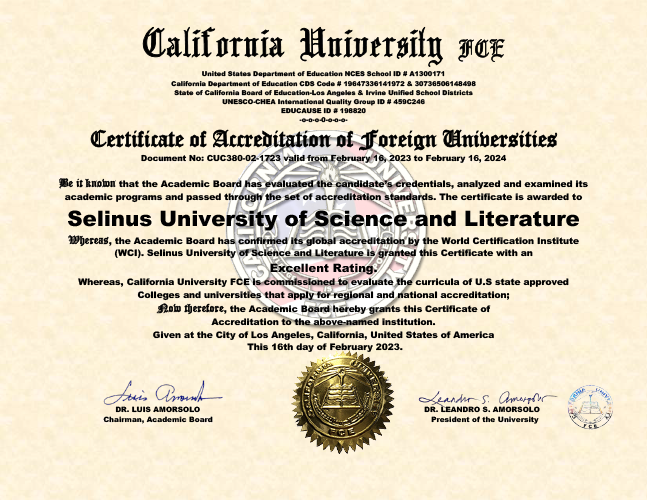 Selinus cooperates with the California University CFE for the issuance of the equivalent degree in the USA.